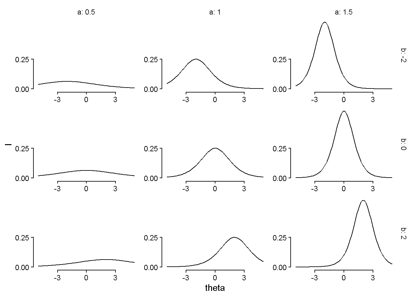 \[ logodds(P(Y = 1)) = a (\theta - b) \], where \(b\) represents the item’s difficulty and \(a\) represents the item’s discrimination.