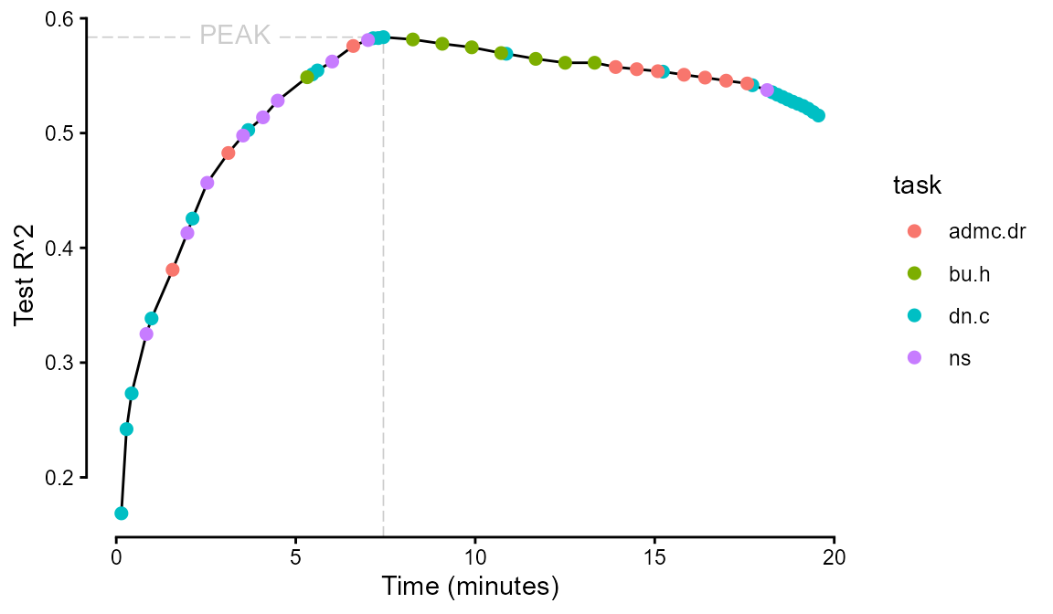 labs(x = "Time (minutes)", y = "Test R^2") +