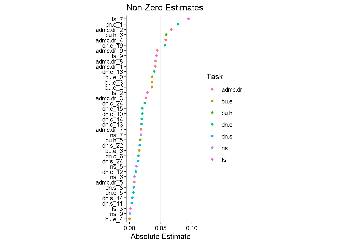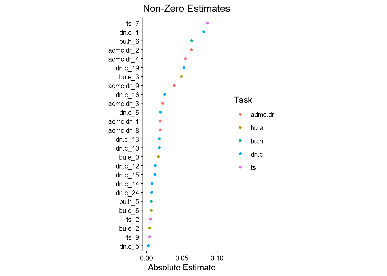 labs(y = NULL, color = "Task", title = "Non-Zero Estimates", x = "Absolute Estimate") +