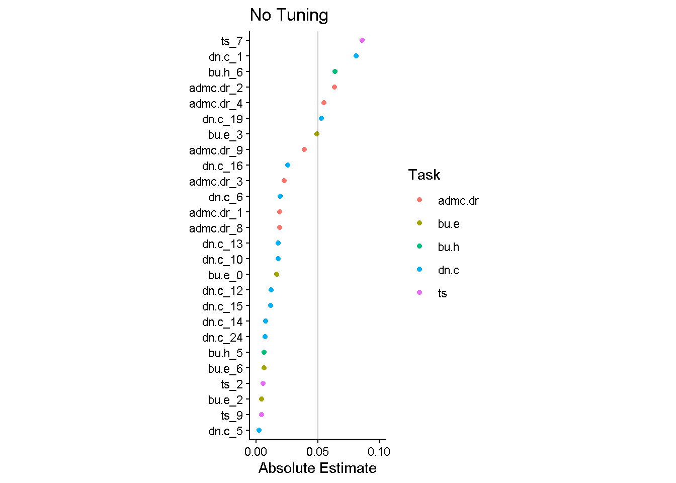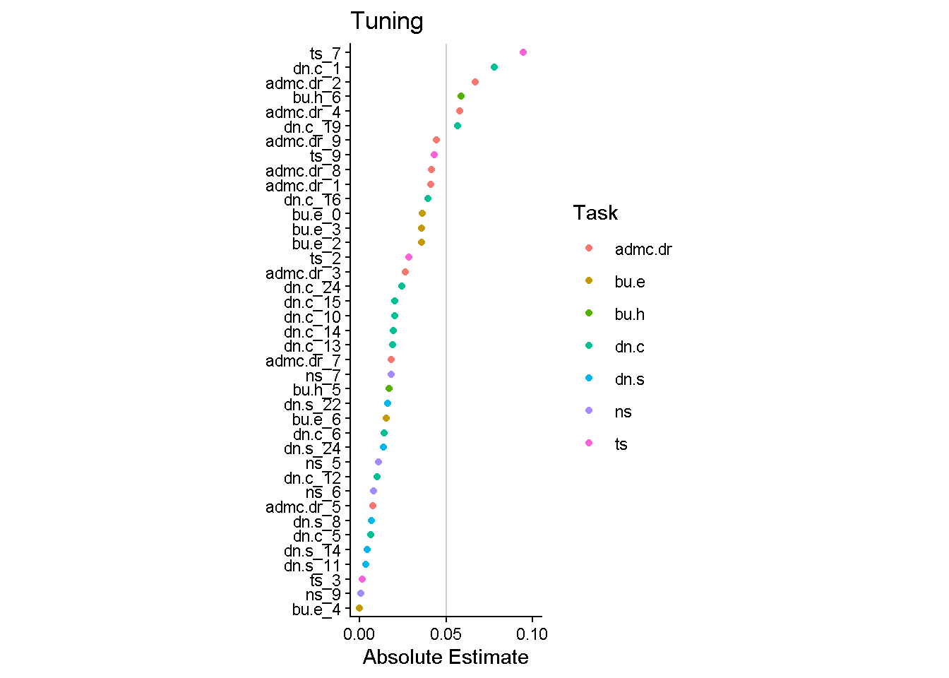 labs(y = NULL, color = "Task", title = "Tuning", x = "Absolute Estimate") +