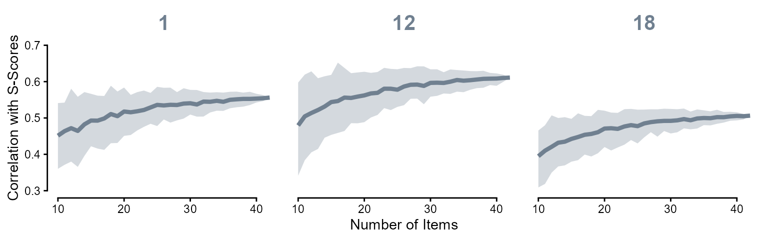 plotly::ggplotly()The x-axis represents the number of items included in the correlation, and the y-axis represents the magnitude of the correlation with s-scores. Shaded areas represent the 90% interval of the correlation values.